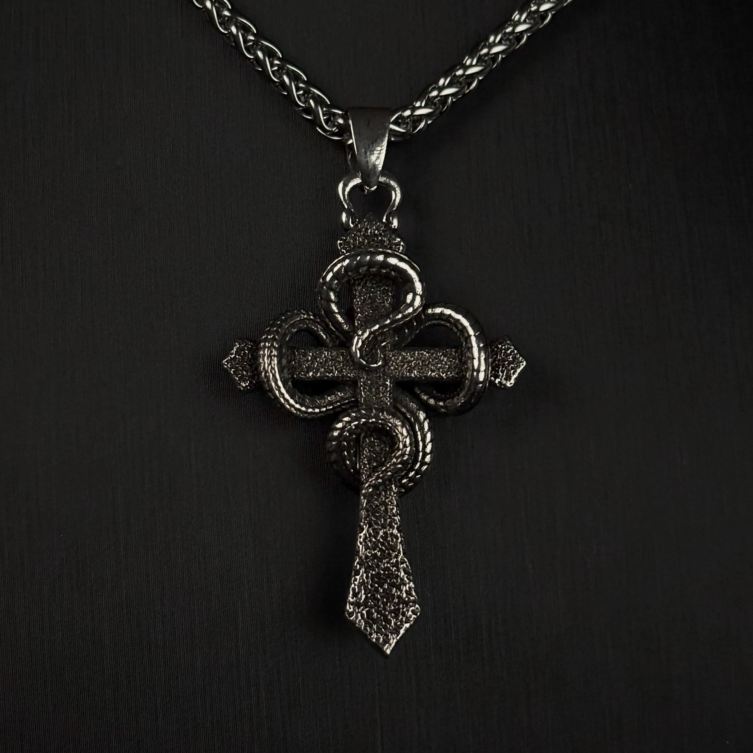 Serpentbound Cross merges sacred conviction with primal instinct. Forged from titanium steel, the cross—once a symbol of order—is now wrapped in a coiled serpent, twisting faith into something raw and untamed. In the Iron Age Collection, it speaks to inner conflict: belief entangled by desire, purity strangled by survival. Serpentbound Cross is not about surrendering to darkness, but about carrying it—and choosing to endure.